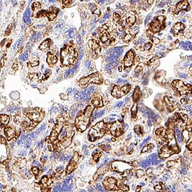 VCTS021). Tissue was stained using DAB (brown) and counterstained with hematoxylin (blue). Specific staining was localized to endothelial cells in chorionic villi. View our protocol for IHC Staining with VisUCyte HRP Polymer Detection Reagents.