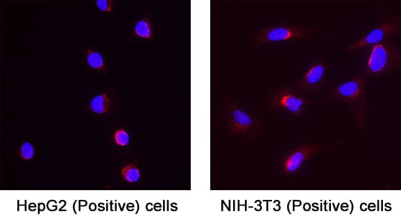 Sample: Immersion fixed PC‑12 rat adrenal pheochromocytoma cell line, HepG2 human hepatocellular carcinoma cell line (Positive) & NIH-3T3 mouse embryonic fibroblast cell line (Negative)