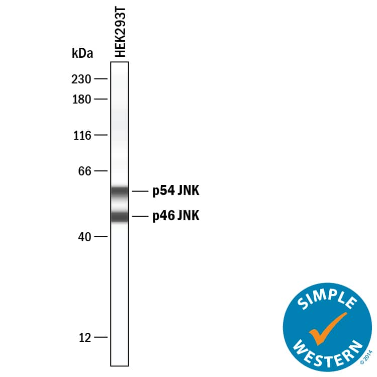 Detects human, mouse, and rat p46 and p54 JNK1/JNK2. Does not detect recombinant JNK3.