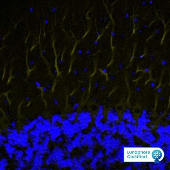 Phospho-ERK1 (T202/Y204)/ERK2 (T185/Y187) was detected in immersion fixed paraffin-embedded sections of human Cortex using Rabbit Anti-Human Phospho-ERK1 (T202/Y204)/ERK2 (T185/Y187) , Polyclonal Antibody (Catalog #AF1018) at 25ug/mL at 37 ° Celsius for 8 minutes. Before incubation with the primary antibody, tissue underwent an all-in-one dewaxing and antigen retrieval preprocessing using PreTreatment Module (PT Module) and Dewax and HIER Buffer H (pH 9; Epredia Catalog # TA-999-DHBH). Tissue was stained using the Alexa Fluor™ Plus 647 Goat anti-Rabbit IgG Secondary Antibody at 1:200 at 37 ° Celsius for 2 minutes. (Yellow; Lunaphore Catalog # DR647RB) and counterstained with DAPI (blue; Lunaphore Catalog # DR100). Specific staining was localized to the cytoplasm and nucleus of the neuron. Protocol available in COMET™ Panel Builder.Detection of Phospho-ERK1 (T202/Y204)/ERK2 (T185/Y187) in Mouse Cerebellum via seqIF™ staining on COMET™