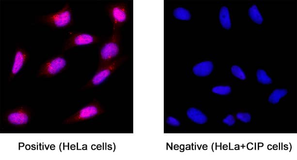 Sample: Immersion fixed HeLa Human Cervical Epithelial Carcinoma Cells (Positive control) and HeLa Human Cervical Epithelial Carcinoma Cells treated with CIP (Calf Intestinal Phosphatase) (Negative Control)