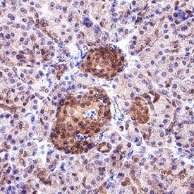 PTEN was detected in immersion fixed paraffin-embedded sections of human pancreas using Rabbit Anti-Human/Mouse/Rat PTEN Antigen Affinity-purified Polyclonal Antibody (Catalog # AF847) at 3 µg/mL for 1 hour at room temperature followed by incubation with the Anti-Rabbit IgG VisUCyte™ HRP Polymer Antibody (VC003). Before incubation with the primary antibody, tissue was subjected to heat-induced epitope retrieval using Antigen Retrieval Reagent-Basic (CTS013). Tissue was stained using DAB (brown) and counterstained with hematoxylin (blue). Specific staining was localized to cytoplasm in islet cells. Staining was performed using our protocol for IHC Staining with VisUCyte HRP Polymer Detection Reagents.PTEN in Mouse Pancreas.
