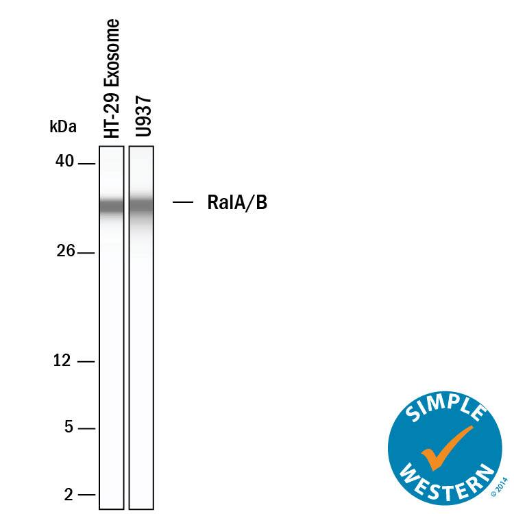 Simple Western shows lysates of Exosome Standards (HT-29) (NBP3-11685) and U937 human histiocytic lymphoma cell line, loaded at 0.5 mg/ml. A specific band was detected for RalA/RalB at approximately 32 kDa (as indicated) using 10 µg/mL of Goat Anti-Human/Mouse/Rat RalA/RalB Antigen Affinity-purified Polyclonal Antibody (Catalog # AF3204). This experiment was conducted under reducing conditions and using the 2-40kDa separation system.Applications for Human/Mouse/Rat RalA/RalB Antibody