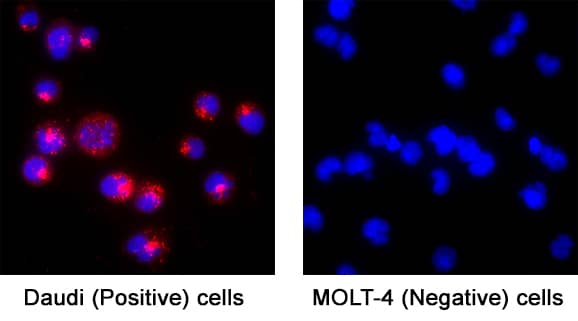 Sample: Immersion fixed HeLa Human Cervical Epithelial Carcinoma, Daudi Human Burkitt's Lymphoma (Positive) and MOLT‑4 Human Acute Lymphoblastic Leukemia (Negative) Cell Line Cells.