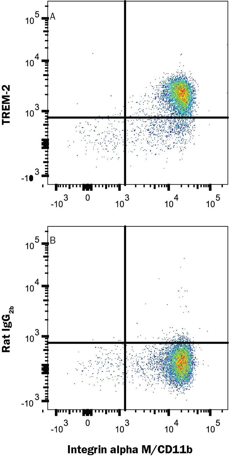 Human PBMC monocytes were stained with (A) Rat Anti-Human/Mouse TREM2 Monoclonal Antibody (Catalog # MAB17291R) or (B) Rat IgG2B Isotype control antibody (MAB0061) followed by Allophycocyanin-conjugated Anti-Rat IgG Secondary Antibody (F0113) and Rat anti-Mouse Integrin alpha M/CD11b PE-conjugated Monoclonal Antibody (FAB1124P). Staining was performed using our Staining Membrane-Associated Proteins protocol.Applications for Human/Mouse TREM2 Antibody