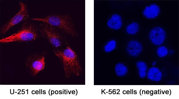 Sample: Immersion fixed U251 human myeloma cell line (positive) and K562 human chronic myelogenous leukemia cell line (negative)