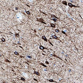NF-L was detected in immersion fixed paraffin-embedded sections of human brain (hippocampus) using Mouse Anti-Human NF-L Monoclonal Antibody (Catalog # MAB22164) at 5 µg/mL for 1 hour at room temperature followed by incubation with the Anti-Mouse IgG VisUCyte™ HRP Polymer Antibody (VC001). Before incubation with the primary antibody, tissue was subjected to heat-induced epitope retrieval using Antigen Retrieval Reagent-Basic (CTS013). Tissue was stained using DAB (brown) and counterstained with hematoxylin (blue). Specific staining was localized to cytoplasm in neurons. Staining was performed using our protocol for IHC Staining with VisUCyte HRP Polymer Detection Reagents.
