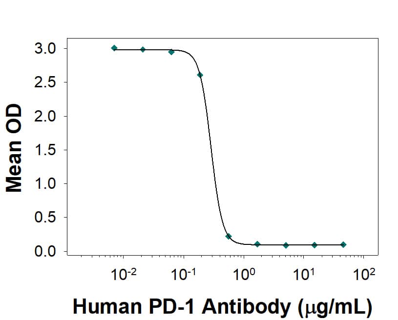 In a functional ELISA, 0.15-2.10 µg/mL of this antibody will block 50% of the binding of 5 µg/mL of Recombinant Human PD-L1/B7-H1 Fc Chimera (Catalog # 156-B7) to immobilized Recombinant Human PD‑1 His-tagged Protein (Catalog # 8986-PD) coated at 1 µg/mL (100 µL/well). At 10 µg/mL, this antibody will block >90% of the binding.