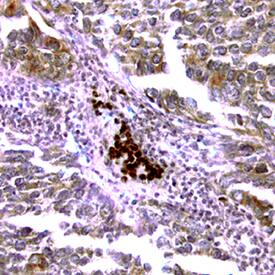 Recombinant Human PDGF-AA (221-AA) stimulates proliferation in the NR6R-3T3 mouse fibroblast cell line in a dose-dependent manner (orange line). Proliferation elicited by Recombinant Human PDGF-AA (25 ng/mL) is neutralized (green line) by increasing concentrations of Goat Anti-Human PDGF-AA Polyclonal Antibody (Catalog # AB-221-NA). The ND50 is typically 5-10 µg/mL.Detection of PDGF-AA in Breast Cancer.