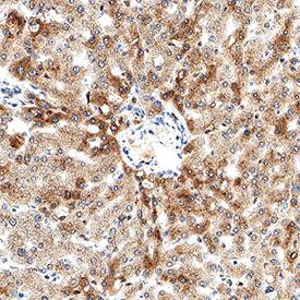 Angiogenin was detected in immersion fixed paraffin-embedded sections of rat kidney using Goat Anti-Human/Rat Angiogenin Antigen Affinity-purified Polyclonal Antibody (Catalog # AF265) at 1 µg/mL for 1 hour at room temperature followed by incubation with the Anti-Goat IgG VisUCyte™ HRP Polymer Antibody (VC004). Before incubation with the primary antibody, tissue was subjected to heat-induced epitope retrieval using Antigen Retrieval Reagent-Basic (CTS013). Tissue was stained using DAB (brown) and counterstained with hematoxylin (blue). Specific staining was localized to convoluted tubules. Staining was performed using our protocol for IHC Staining with VisUCyte HRP Polymer Detection Reagents.Angiogenin in Human Liver.