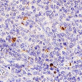 IL-2 was detected in immersion fixed frozen sections of rat spleen using Goat Anti-Human/Rat IL-2 Antigen Affinity-purified Polyclonal Antibody (Catalog # AF-502-NA) at 5 µg/mL overnight at 4 °C. Tissue was stained using the Anti-Goat HRP-DAB Cell & Tissue Staining Kit (brown; CTS008) and counterstained with hematoxylin (blue). Specific staining was localized to cytoplasm in lymphocytes. View our protocol for Chromogenic IHC Staining of Frozen Tissue Sections.Applications for Human/Rat IL-2 Antibody