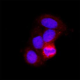 SDHA was detected in immersion fixed MCF-7 human breast cancer cell line using Mouse Anti-Human SDHA Monoclonal Antibody (Catalog # MAB11586) at 8 µg/ml for 3 hours at room temperature. Cells were stained using the NorthernLights™ 557-conjugated Anti-Mouse IgG Secondary Antibody (red; Catalog # NL007) and counterstained with DAPI (blue). Specific staining was localized to the cytoplasm. View our protocol for Fluorescent ICC Staining of Cells on Coverslips.