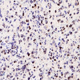 SOX21 was detected in immersion fixed paraffin-embedded sections of human glioblastoma using Goat Anti-Human SOX21 Antigen Affinity-purified Polyclonal Antibody (Catalog # AF3538) at 0.5 µg/ml for 1 hour at room temperature followed by incubation with the HRP-conjugated Anti-Goat IgG Secondary Antibody (Catalog # HAF017) or the Anti-Goat IgG VisUCyte™ HRP Polymer Antibody (Catalog # VC004). Before incubation with the primary antibody, tissue was subjected to heat-induced epitope retrieval using VisUCyte Antigen Retrieval Reagent-Basic (Catalog # VCTS021). Tissue was stained using DAB (brown) and counterstained with hematoxylin (blue). Specific staining was localized to the nucleus. View our protocol for Chromogenic IHC Staining of Paraffin-embedded Tissue Sections.Applications for Human SOX21 Antibody
