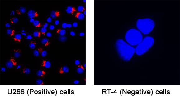 Sample: Immersion fixed U266 human myeloma cell line (Positive) & RT-4 human urinary bladder transitional cell papilloma cell line (Negative)