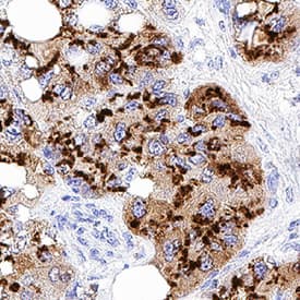 ST6 Gal Sialyltransferase 1/ST6GAL1 was detected in immersion fixed paraffin-embedded sections of human liver using Goat Anti-Human ST6 Gal Sialyltransferase 1/ST6GAL1 Antigen Affinity-purified Polyclonal Antibody (Catalog # AF5924) at 0.3 µg/mL for 1 hour at room temperature followed by incubation with the Anti-Goat IgG VisUCyte™ HRP Polymer Antibody (VC004). Before incubation with the primary antibody, tissue was subjected to heat-induced epitope retrieval using Antigen Retrieval Reagent-Basic (CTS013). Tissue was stained using DAB (brown) and counterstained with hematoxylin (blue). Specific staining was localized to cytoplasm in hepatocytes. Staining was performed using our protocol for IHC Staining with VisUCyte HRP Polymer Detection Reagents.