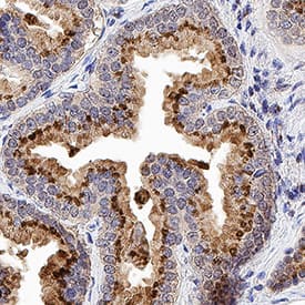 ST6 Gal Sialyltransferase 1/ST6GAL1 was detected in immersion fixed paraffin-embedded sections of human prostate using Goat Anti-Human ST6 Gal Sialyltransferase 1/ST6GAL1 Antigen Affinity-purified Polyclonal Antibody (Catalog # AF5924) at 1 µg/mL for 1 hour at room temperature followed by incubation with the Anti-Goat IgG VisUCyte™ HRP Polymer Antibody (VC004). Before incubation with the primary antibody, tissue was subjected to heat-induced epitope retrieval using Antigen Retrieval Reagent-Basic (CTS013). Tissue was stained using DAB (brown) and counterstained with hematoxylin (blue). Specific staining was localized to cytoplasm in glandular epithelial cells. Staining was performed using our protocol for IHC Staining with VisUCyte HRP Polymer Detection Reagents.