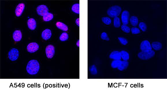 TBX18 was detected in immersion fixed A549 human lung carcinoma cell line (positive staining) and MCF-7 human breast cancer cell line using Mouse Anti-Human TBX18 Monoclonal Antibody (Catalog # MAB63371) at 8 µg/mL for 3 hours at room temperature. Cells were stained using the NorthernLights™ 557-conjugated Anti-Mouse IgG Secondary Antibody (red; NL007) and counterstained with DAPI (blue). Specific staining was localized to cell nuclei. Staining was performed using our protocol for Fluorescent ICC Staining of Non-adherent Cells.Applications for Human TBX18 Antibody