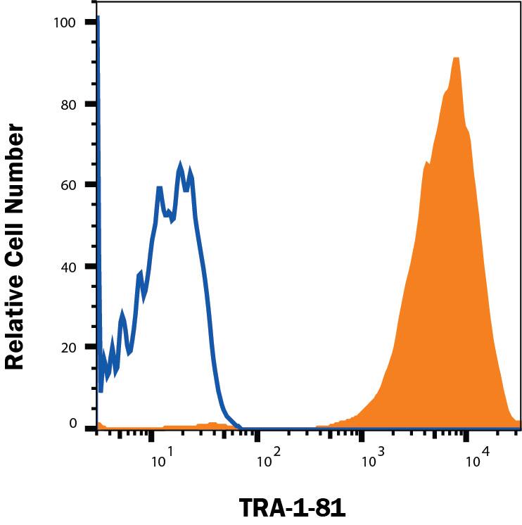 iPSC cells were stained with Mouse Anti-Human TRA-1-81 PE-conjugated Monoclonal Antibody (Catalog # FAB8495P, filled histogram) or isotype control antibody (Catalog # IC015P, open histogram). View our protocol for Staining Membrane-associated Proteins.Applications for Human TRA-1-81 PE-conjugated Antibody