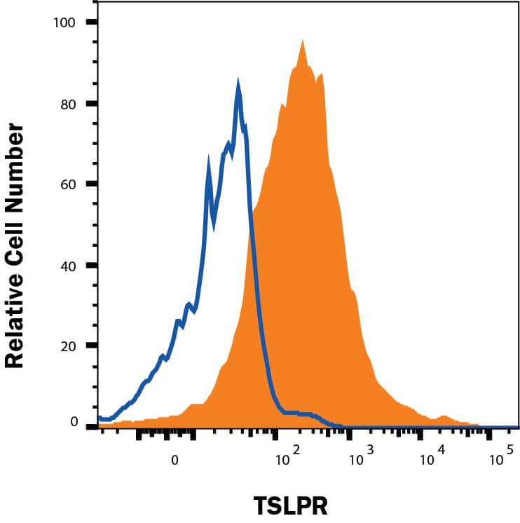NS0 cells transfected with hTSLPR (filled histogram) vs Irrelevant NS0 transfectant cells (open histogram) were stained with Mouse Anti-Human TSLPR Monoclonal Antibody (Catalog # MAB9811) followed by Phycoerythrin-conjugated Anti-Mouse IgG Secondary Antibody (Catalog # F0102B). View our protocol for Staining Membrane-associated Proteins.