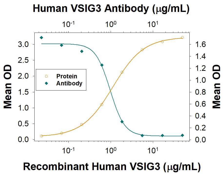 In a functional ELISA, 0.2-2 µg/mL of Mouse Anti-Human VSIG3 Monoclonal Antibody (Catalog # MAB92293) will block 50% of the binding of 1 µg/mL of Recombinant Human VSIG3 Fc Chimera (9229-VS) to immobilized Recombinant Human VISTA/B7-H5/PD-1H Fc Chimera (7126-B7) coated at 1 µg/mL (100 µL/well). At 10 µg/mL, this antibody will block >90% of the binding.Applications for Human VSIG3 Antibody