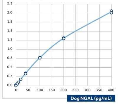 ELISA: NBP2-41364 binds free dog NGAL. NBP2-41364 (as biotinylated detection antibody) forms a sandwich ELISA pair with NBP2-23599 (as capture antibody) for measuring dog NGAL, giving a detection limit of 5 pg/mL in an unoptimized buffer assay.
