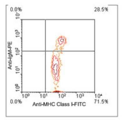 Flow Cytometry: MHC Class I Antibody (F21-2) [FITC] [NBP1-28305] - 1 ug/10^6 Chicken peripheral blood mononuclear cells were double-stained with mouse anti-chicken MHC Class I-FITC and mouse anti-chicken IgM-PE. Small lymphocytes were then gated and analyzed on a flow cytometer