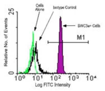 Flow Cytometry: Monocyte/Granulocyte Antibody (74-22-15) [FITC] [NBP1-28242] - 1 ug/10^6 cells Fresh heparinized blood from a healthy adult pig was stained with mouse anti-pig Monocyte/Granulocyte-FITC. Red blood cells were lyzed with ammonium chloride and the cells were then fixed in 1% paraformaldehyde. Granulocytes were gated and analyzed on a flow cytometer