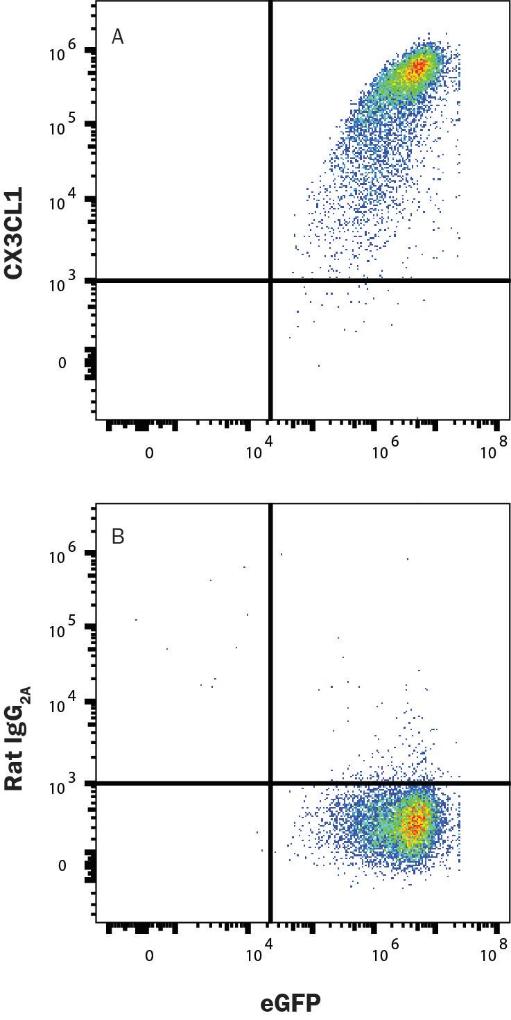HEK293 cells transfected with mouse CX3CL1 and eGFP was stained with eGFP and either (A) Rat Anti-Mouse CX3CL1/Fractalkine APC-conjugated Monoclonal Antibody (Catalog # FAB571A) or (B) Rat IgG2A Allophycocyanin Isotype Control (Catalog # IC006A). View our protocol for Staining Membrane-associated Proteins.Applications for Mouse CX3CL1/Fractalkine APC-conjugated Antibody