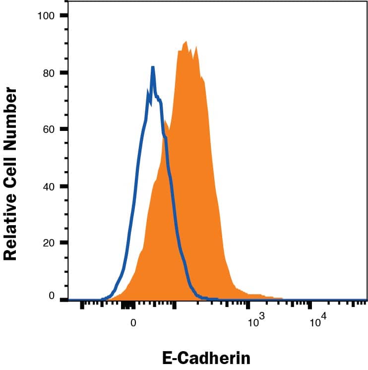 mlMCD3 cells were stained with Rat Anti-Mouse E-Cadherin Monoclonal Antibody (Catalog # MAB7481, filled histogram) or isotype control antibody (Catalog # MAB006, open histogram), followed by Phycoerythrin-conjugated Anti-Rat IgG Secondary Antibody (Catalog # F0105B). View our protocol for Staining Membrane-associated Proteins.Applications for Mouse E-Cadherin Antibody