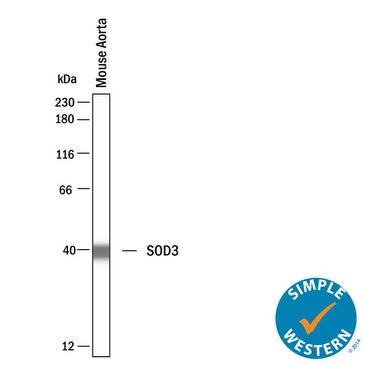 Simple Western shows lysates of mouse aorta, loaded at 0.5 mg/ml. A specific band was detected for SOD3/EC-SOD at approximately 40 kDa (as indicated) using 20 µg/mL of Goat Anti-Mouse SOD3/EC-SOD Antigen Affinity-purified Polyclonal Antibody (Catalog # AF4817). This experiment was conducted under reducing conditions and using the 12-230kDa separation system.Applications for Mouse SOD3/EC-SOD Antibody