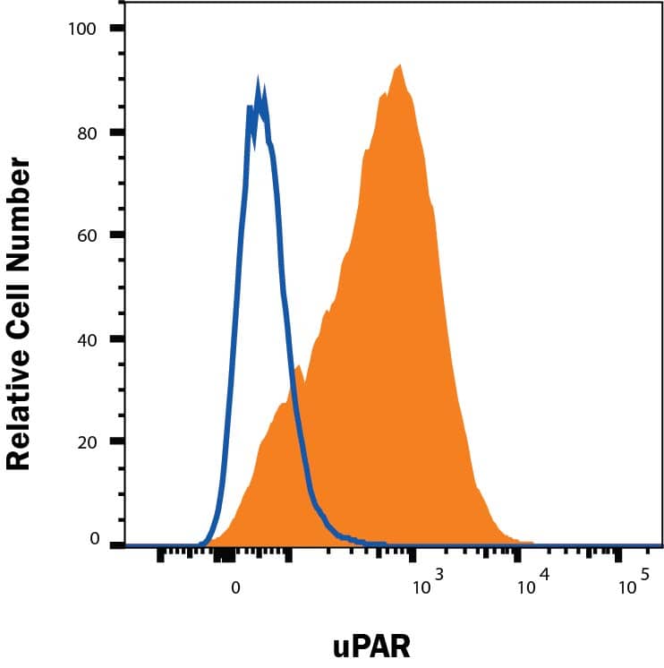 Expression of murine Plaur in AT84 cells.In vitro characterization of AT84 cells stably transfected with either empty vector (EV) or a vector containing cDNA encoding murine uPAR (Plaur). A: Western blot analysis of whole cell lysates using a polyclonal anti-murine uPAR antibody (AF534). A total of 7.5 ng of recombinant murine uPAR (rmuPAR) was loaded as a positive control. Re-probing for beta-actin was used as a loading control. B: Western blot analysis of cellular membrane fractions using a polyclonal anti-murine uPAR antibody (AF534). Total protein was measured per sample and 53.5 µg of protein was loaded per lane. A and B: Images were cropped, as no additional bands were detectable. C: FACS analysis of non-permeabilized cells using a polyclonal anti-murine uPAR antibody (AF534). Alexa Fluor 488 anti-goat secondary antibody (A11055) was used as the secondary antibody. The quantified mean Alexa 488 fluorescence signal per cell line is presented in the panel to the right. D and E: Relative Plaur mRNA (uPAR) (D) or Plau mRNA (uPA) (E) expression levels as analysed using RT-qPCR. All expression levels were normalized to the expression of the reference genes Trfc and beta-actin. Error bars represent the standard error of mean (+SEM) and N = 3. One-way ANOVA; *p<0.05. F: Plasminogen-gelatin (upper panel) and gelatin (lower panel) zymography analysis of conditioned medium of cells cultured for 24 hours in SFM. HMW-uPA and mPLM (mouse plasmin) were loaded as positive controls. The images were cropped to size. G: Relative Plasminogen mRNA (Plg) expression levels as analysed using RT-qPCR. Error bars represent standard error of mean (+SEM) and N = 3. Image collected and cropped by CiteAb from the following open publication (https://pubmed.ncbi.nlm.nih.gov/25157856), licensed under a CC-BY license. Not internally tested by R&D Systems.