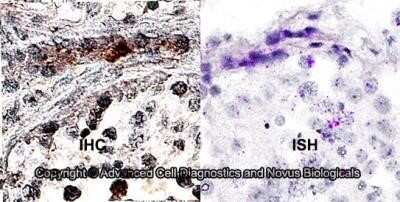 Dual RNAscope ISH-IHC: MRP1 Antibody (IU2H10) - Azide and BSA Free [NBP2-80857] - Formalin-fixed paraffin-embedded tissue sections of human testis were probed for MRP1 mRNA (ACD RNAScope Probe, catalog # 435591; Fast Red chromogen, ACD catalog # 322360). Adjacent tissue section was processed for immunohistochemistry using mouse monoclonal (Novus Biologicals catalog # NB400-156) at 7ug/mL with overnight incubation at 4 degrees Celsius followed by incubation with anti-mouse IgG VisUCyte HRP Polymer Antibody (Catalog # VC001) and DAB chromogen (yellow-brown). Tissue was counterstained with hematoxylin (blue). Specific staining was localized to Leydig cells and seminiferous tubule cells. Image from the standard format of this antibody.