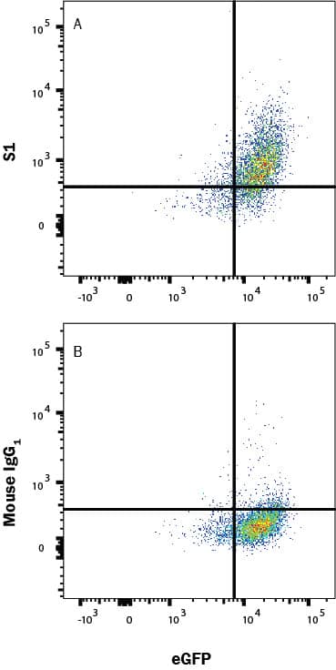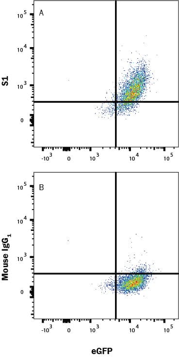 HEK293 human embryonic kidney cell line transfected with human ACE-2 and eGFP was incubated with Recombinant SARS-CoV-2 Spike S1 Subunit His-Tag protein (10522-CV), then stained with (A) Mouse Anti-SARS-CoV-2 Spike S1 Monoclonal Antibody (Catalog # MAB105403) or (B) Mouse IgG1 Isotype Control Antibody (MAB002) followed by Allophycocyanin-conjugated Anti-Mouse IgG Secondary Antibody (F0101B). Prior to staining, cells were fixed with Flow Cytometry Fixation Buffer (FC004). Staining was performed using our Staining Membrane-associated Proteins protocol.Applications for SARS-CoV-2 Spike S1 Subunit Antibody