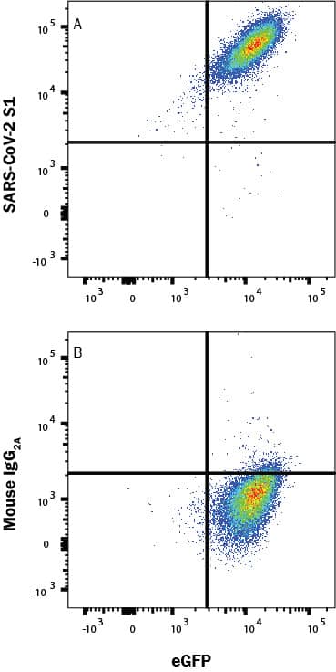 HEK293 human embryonic kidney cell line transfected with human ACE-2 and eGFP was incubated with Recombinant SARS-CoV-2 Spike S1 Subunit His-Tag protein (10522-CV), then stained with (A) Mouse Anti-SARS-CoV-2 Spike S1 Monoclonal Antibody (Catalog # MAB105805) or (B) Mouse IgG2A Isotype Control Antibody (MAB003) followed by Allophycocyanin-conjugated Anti-Mouse IgG Secondary Antibody (F0101B). Staining was performed using our Staining Membrane-associated Proteins protocol.Applications for SARS-CoV-2 Spike S1 Subunit Antibody