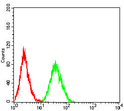 Flow Cytometry: Siglec-15 Antibody (3F7F3) [NBP3-27165] - Analysis of Jurkat cells using Siglec-15 mouse mAb (green) and negative control (red).Applications for Siglec-15 Antibody (3F7F3) - BSA Free