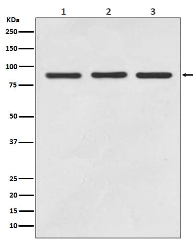 Western Blot: STAT5a/b Antibody (SR2282) [NBP3-21692] - Western blot analysis using NBP3-21692 in (1) Jurkat cell lysate; (2) 3T3 cell lysate; (2) PC12 cell lysate.Applications for STAT5a/b Antibody (SR2282) - BSA Free