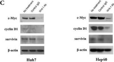 Western Blot: Survivin Antibody [HRP] [NB500-201H] - sFZD7 inhibits Wnt/ beta-catenin signaling & suppresses the expression of downstream oncoproteins. (A). sFZD7 decreased nuclear beta-catenin accumulation but did not decrease cytoplasmic beta-catenin in Huh7 & HepG2 cells. Histone-H3 & beta-actin were used as loading controls for nuclear & cytoplasmic proteins, respectively. (B). Tcf4 reporter assay of Tcf4-dependent transcriptional activity in Huh7 & HepG2 cells. Cells were co-transfected with plasmid encoding beta-gal (a control for transfection efficiency) & either the pTOPFLASH or pFOPFLASH reporters. Cells were incubated with control PBS or sFZD7 at various concentrations & harvested after 48 h to measure luciferase & beta-gal activities. Reporter gene activation is expressed as relative light units (RLU) detected in pTOPFLASH or pFOPFLASH transfected cells & normalized for beta-galactosidase activity. The results are expressed as mean ± SD (error bars). Experiments were performed in triplicates (Independent t-test, *P < 0.05.) (C). The effect of sFZD7 on the expression of beta-catenin/Tcf4 target genes c-Myc, cyclin D1, & survivin. Huh7 & HepG2 cells were incubated for 48 h with sFZD7 at various concentrations & c-Myc, cyclin D1, survivin, & beta-actin (loading control) levels were determined by Western blotting using specific antibodies. Image collected & cropped by CiteAb from the following publication (https://molecular-cancer.biomedcentral.com/articles/10.1186/1476-4598-10-16), licensed under a CC-BY license. Not internally tested by Novus Biologicals.