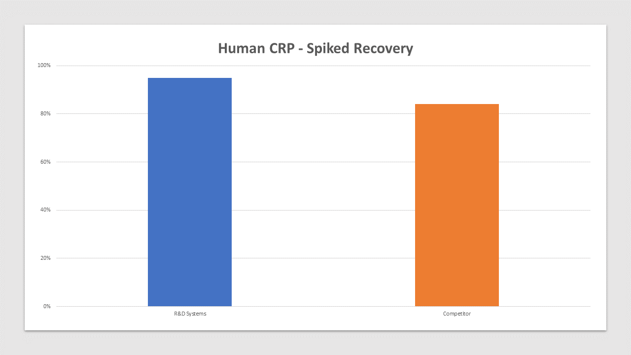 CRP is spiked at three known concentrations throughout the range of the assay and run to measure response of the spiked sample matrix. Culture media recovery is 95% compared to 84% for the top competitor. In spike and recovery experiments, natural samples are spiked with the recombinant target analyte of interest to identify interference caused by sample matrices.Preparation and Storage