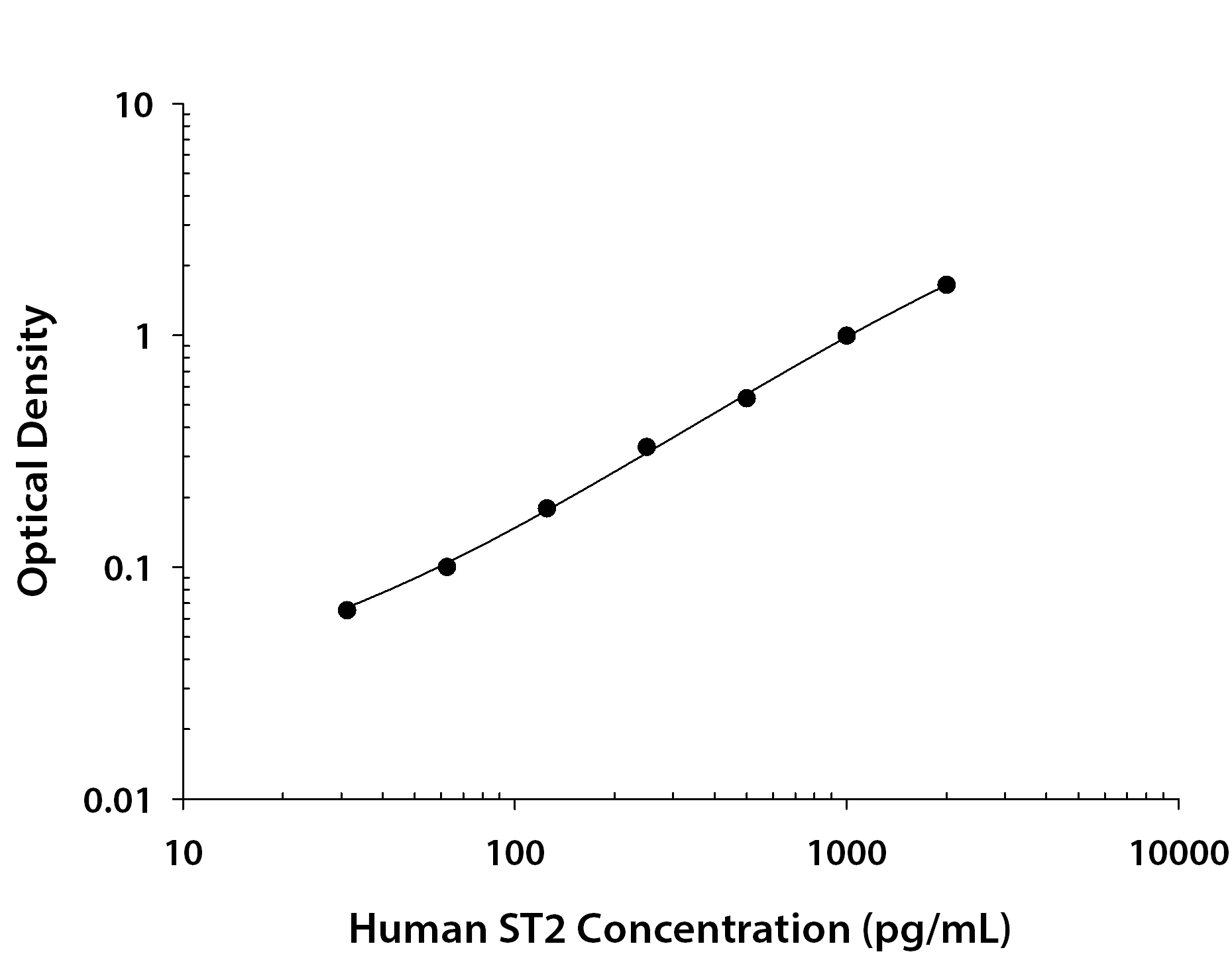 ST2, also known as IL-1R4, is a component of the receptor for the proinflammatory cytokine Interleukin-33. The IL-33 receptor additionally includes IL-1 RAcp which also associates with IL-1 RI and IL-1 R rp2/IL-1 R6. A soluble form of ST2 functions as a decoy receptor. IL-33 promotes Th2-biased immune responses, resulting in eosinophilia, mast cell activation, and allergic inflammation. In addition, IL-33 enhances inflammation-associated hypernociception and protects from atherosclerosis and cardiac myocyte hypertrophy. Soluble ST2 is elevated in the serum under inflammatory conditions including allergic asthma, sepsis, trauma, dengue fever, pulmonary disease, and lupus. It is also associated aortic stenosis, congestive cardiomyopathy, and risk of cardiovascular heart failure and death.
