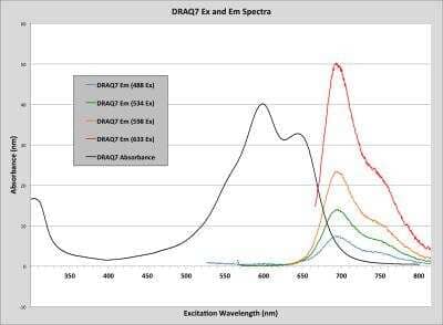 The excitation wavelength maxima of DRAQ7 (TM) are 600 nm / 646 nm but it can also be suboptimally excited by the 488nm (blue) laser for flow cytometry. The emission wavelength maximum of this viability dye is 697 nm when bound to dsDNA. The fluorescence signal is proportional and stoichiometric to the amount of bound DNA.