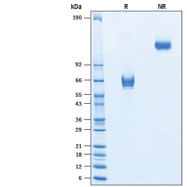 2 μg/lane of Recombinant Cynomolgus Monkey Lymphotoxin beta R/TNFRSF3 Fc Chimera (Catalog # 10759-LR) was resolved with SDS-PAGE under reducing (R) and non-reducing (NR) conditions and visualized by Coomassie® Blue staining, showing bands at 57-68 kDa and 114-136 kDa, respectively.Formulation, Preparation and Storage
