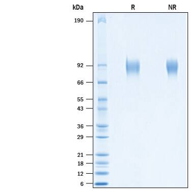 2 μg/lane of Recombinant Cynomolgus Monkey IFN-alpha/beta R1 Protein, CF (Catalog # 10674-AB) was resolved with SDS-PAGE under reducing (R) and non-reducing (NR) conditions and visualized by Coomassie® Blue staining, showing bands at 80-100 kDa.Formulation, Preparation and Storage