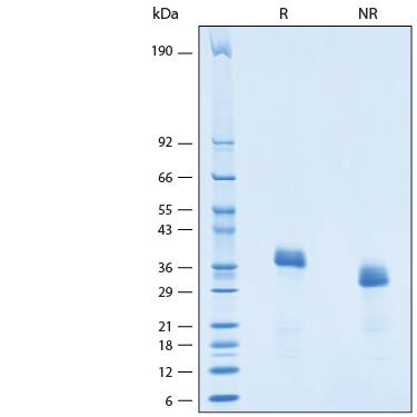 2 μg/lane of Recombinant Cynomolgus/Rhesus Macaque Dkk-1 Protein (Catalog # 10450-DK) was resolved with SDS-PAGE under reducing (R) and non-reducing (NR) conditions and visualized by Coomassie® Blue staining, showing bands at 35-39 kDa.Formulation, Preparation and Storage