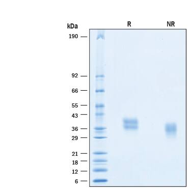 2 μg/lane of Biotinylated Recombinant Human 4-1BB/TNFRSF9 His Avi-tag Protein (Catalog # AVI9220) was resolved with SDS-PAGE under reducing (R) and non-reducing (NR) conditions and visualized by Coomassie® Blue staining, showing bands at 34-41 kDa.Formulation, Preparation and Storage