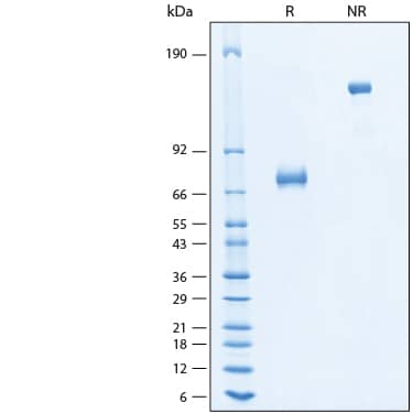 2 μg/lane of Recombinant Human B7-H3 Fc Chimera Alexa Fluor® 647 Protein (Catalog # AFR1027) was resolved with SDS-PAGE under reducing (R) and non-reducing (NR) conditions and visualized by Coomassie® Blue staining, showing bands at 70-80 kDa and 140-160 kDa, respectively.Formulation, Preparation and Storage