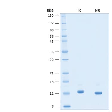 2 μg/lane of Recombinant Human BDNF Protein (Catalog # 11166-BD) was resolved with SDS-PAGE under reducing (R) and non-reducing (NR) conditions and visualized by Coomassie® Blue staining, showing bands at 11-15 kDa.Formulation, Preparation and Storage