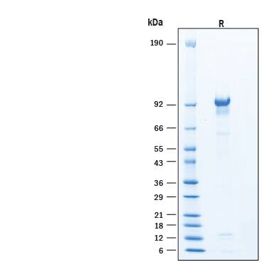 2 μg/lane of Recombinant Human C1qR1/CD93 (24-580) His-tag Protein (Catalog # 11656-CD) was resolved with SDS-PAGE under reducing (R) condition and visualized by Coomassie® Blue staining, showing bands at 80-100 kDa.Formulation, Preparation and Storage