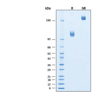2 μg/lane of Biotinylated Recombinant Human CD117/c-kit Fc Chimera Protein (Catalog # BT10961) was resolved with SDS-PAGE under reducing (R) and non-reducing (NR) conditions and visualized by Coomassie® Blue staining, showing bands at 110-120 kDa and 220-240 kDa, respectively.