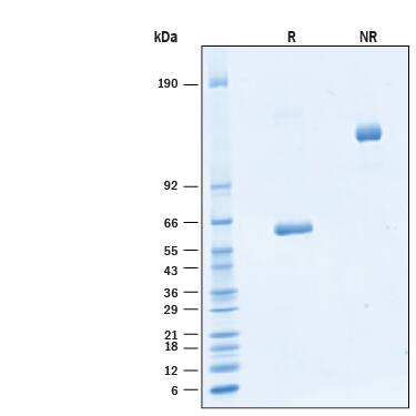2 μg/lane of Biotinylated Recombinant Human CD277/BTN3A1 Fc Chimera Avi-tag Protein (Catalog # AVI8539) was resolved with SDS-PAGE under reducing (R) and non-reducing (NR) conditions and visualized by Coomassie® Blue staining, showing bands at 57-65 kDa and 110-130 kDa, respectively.Formulation, Preparation and Storage