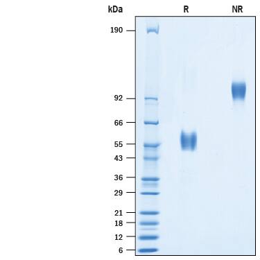 2 μg/lane of Biotinylated Recombinant Human CD3 delta/CD3d Fc Chimera Avi-tag (Catalog # AVI10280) was resolved with SDS-PAGE under reducing (R) and non-reducing (NR) conditions and visualized by Coomassie® Blue staining, showing bands at 54-61 kDa and 108-122 kDa, respectively.